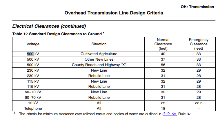 There are federal rules governing how close a power line can be to properties. These are determined by the National Electric Safety Code (NESC), which is not available online. But here's an example of clearance rules in Ohio for 500kV lines over areas where no people live:
