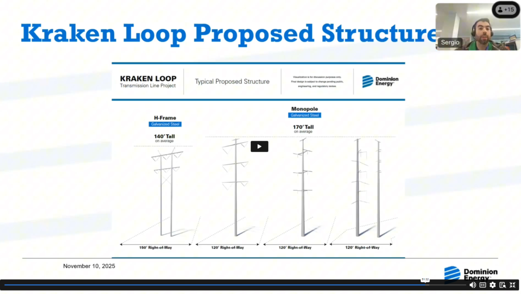 I’ve spent today reviewing some of the old meetings from the Kraken Loop project, and I found that TWICE in the original Kraken Online Meeting held on November 10, 2025, Dominion Energy Rep Sergio confirms that the Kraken Loop is intended to have TWO power lines within the easement. One line is the 500 kV line being publicly announced, and the other is a 230 kV line they’re trying to keep secret. Click on the link below and scroll to the bottom to see the meeting. Sergio speaks about the lines beginning at 49:40.